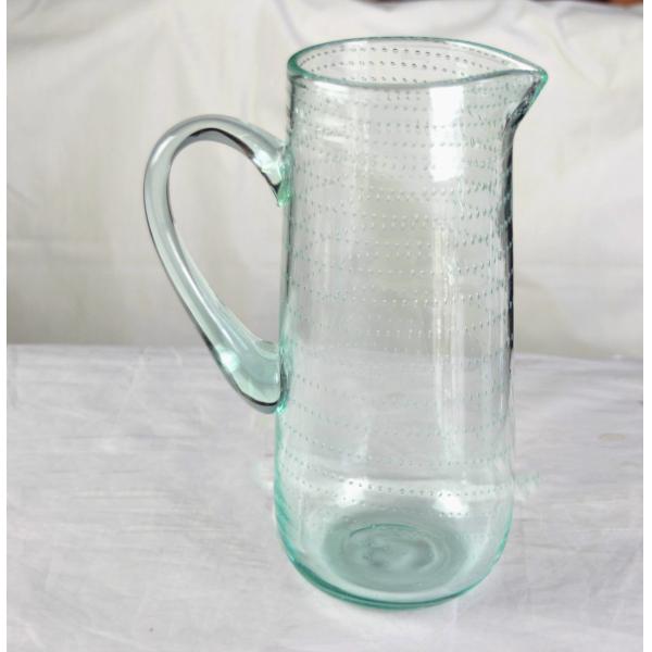 Brief: This is a hand made Bubble Glass Pitcher with Spout and Handle , it has many beautiful bubbles inside , Holds 1.3L. Bubble design inside makes each piece unique, but matching the set. Water Carafe Jug for Hot/Cold Water, Ice Tea and Juice Beverage.